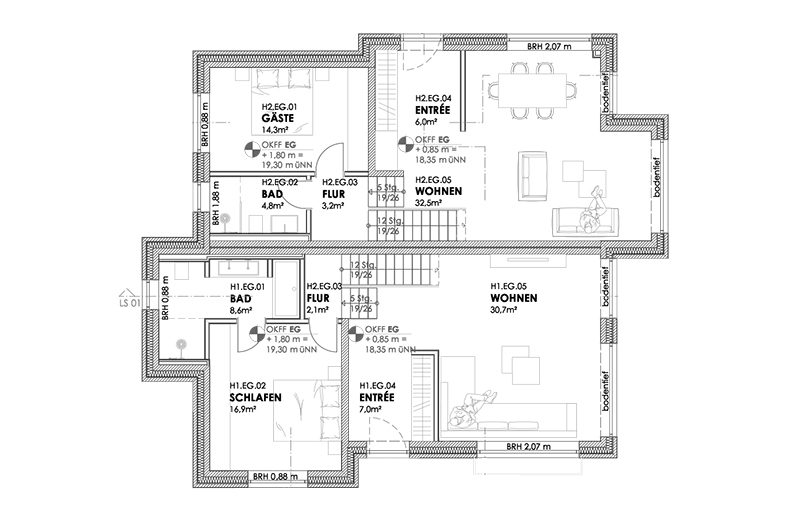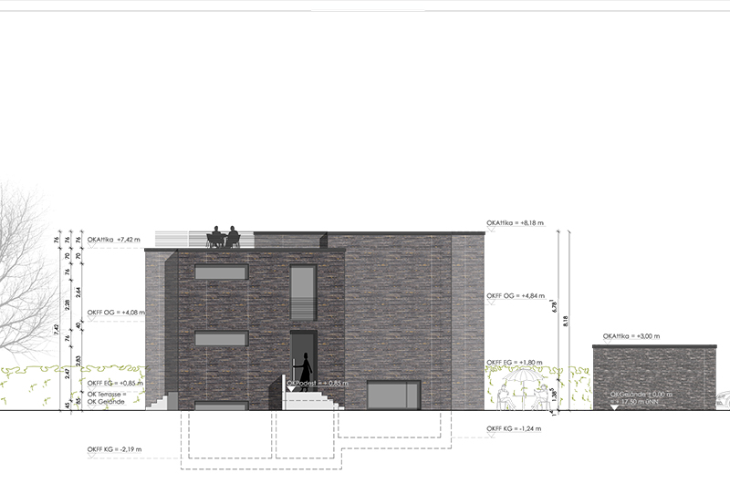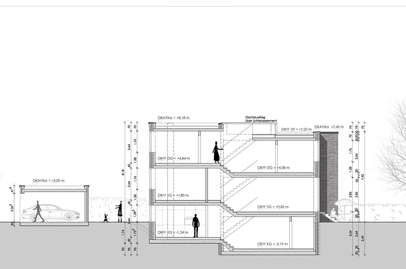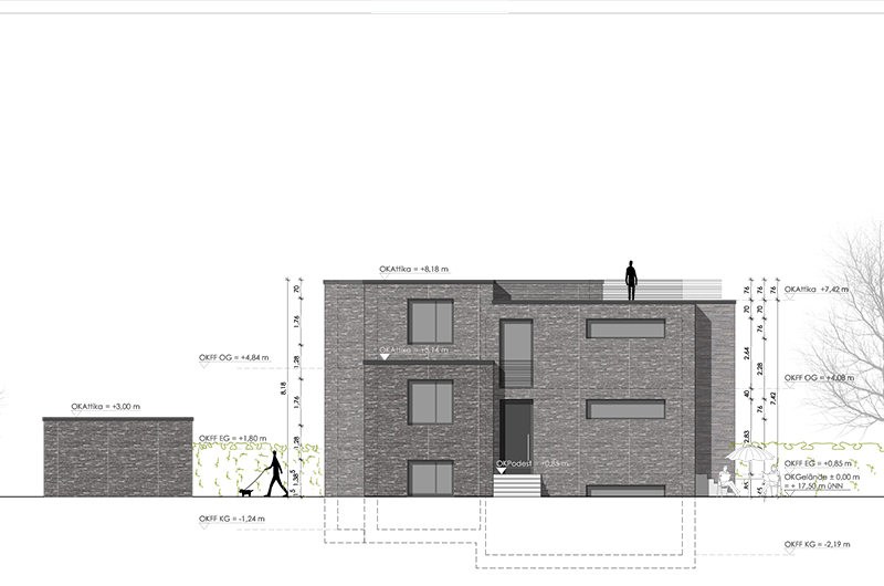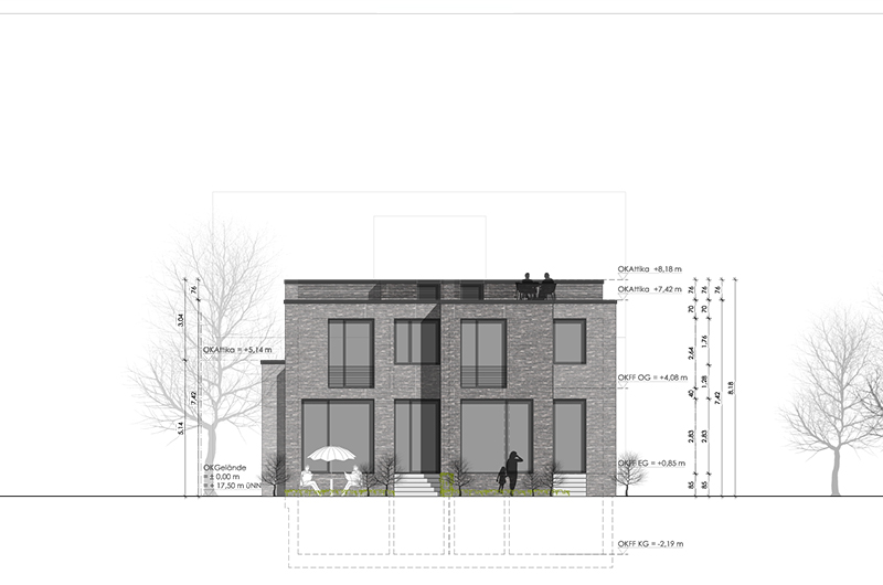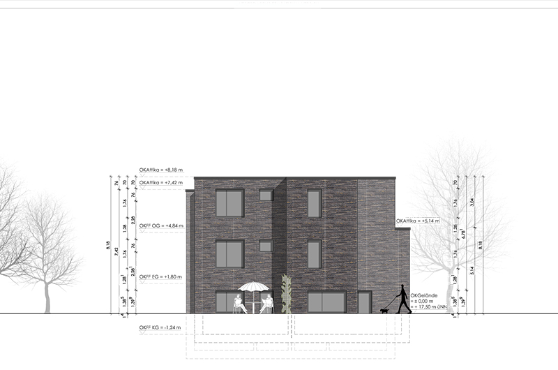 Neubau eines zweigeschossigen Doppelhauses, welches ohne Staffelgeschoss geplant werden musste.
